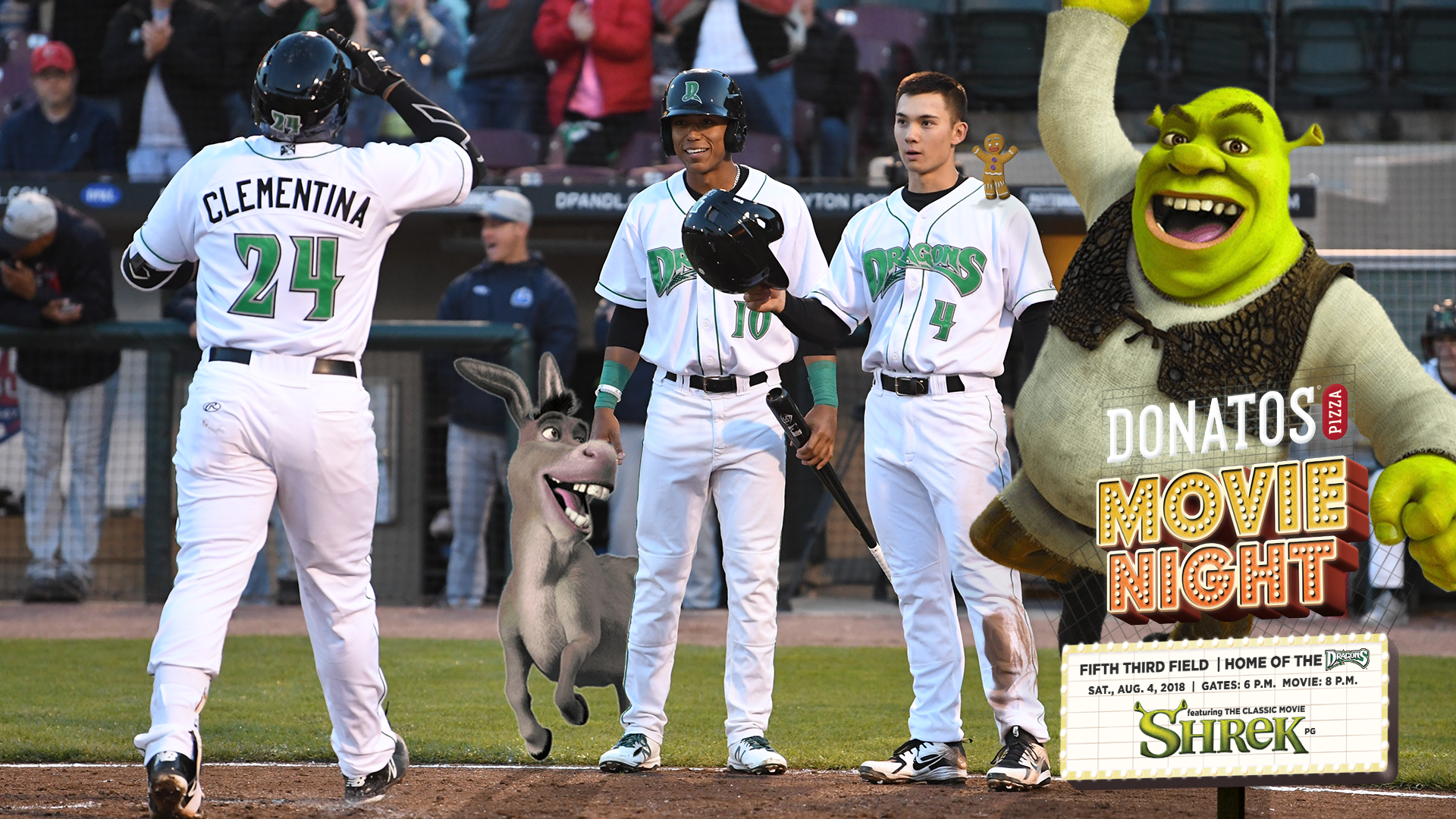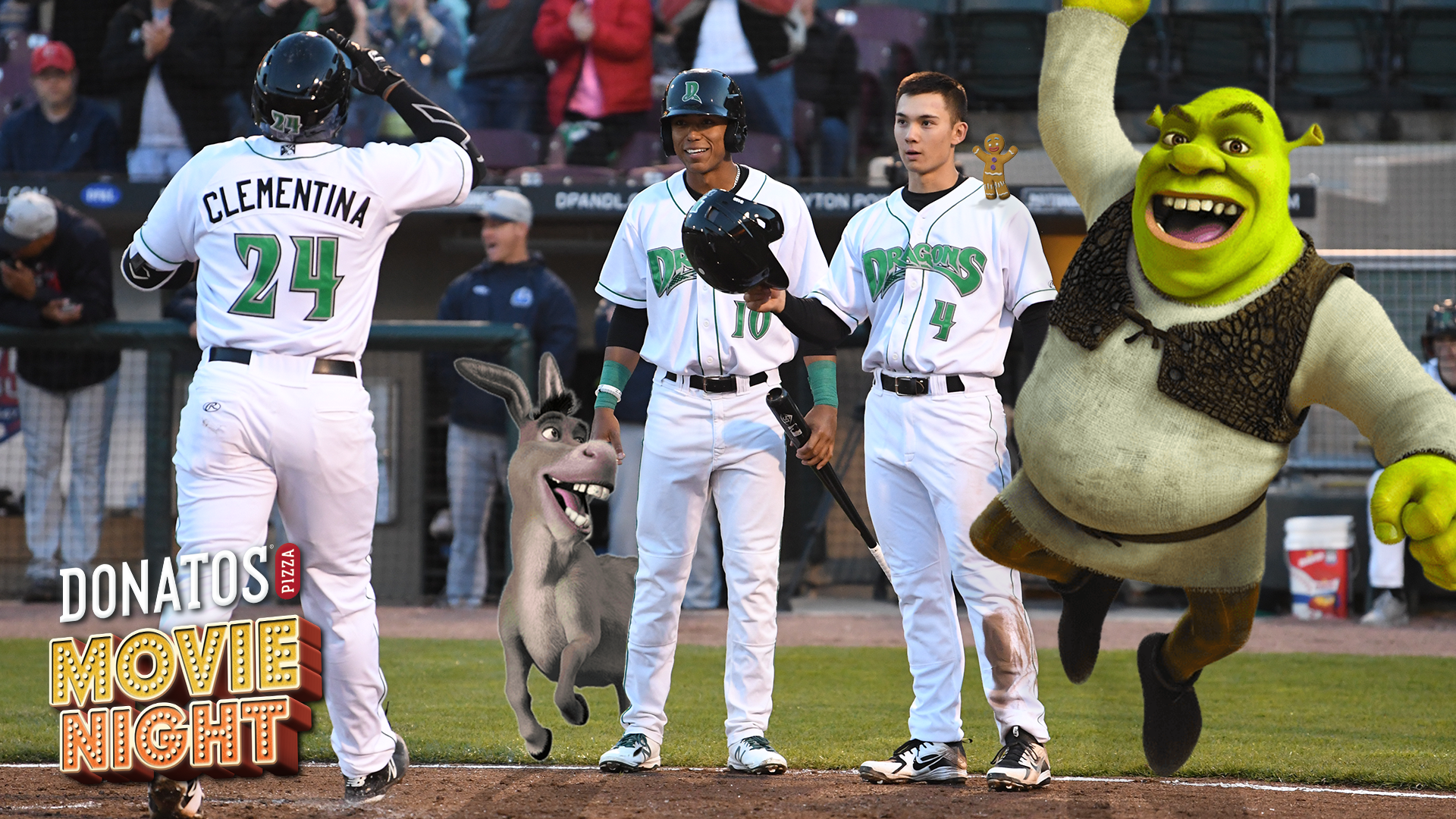 Soon after the work load ran low it picked right back up when the creative director put more trust in my work. I began working on ads around the stadium for sponsors, new projects that were just coming in, and gameday graphics for official and exhibition games. My most memorable projects are featured down below, the social media direction, the kids club baseball cards, the playback logo, and the Donatos Movie Night featuring Shrek. All of them I was granted creative freedom and took off.